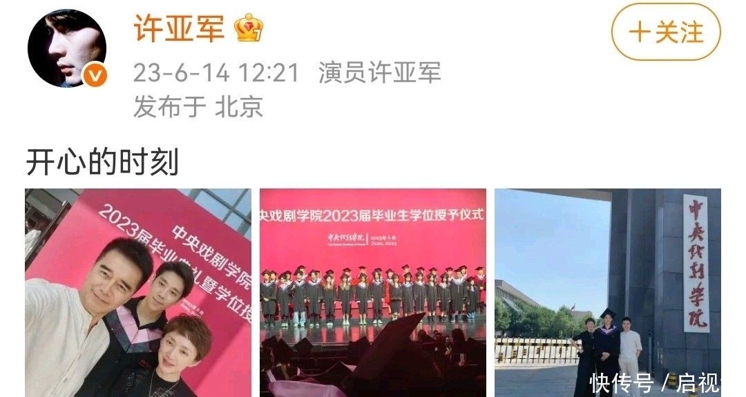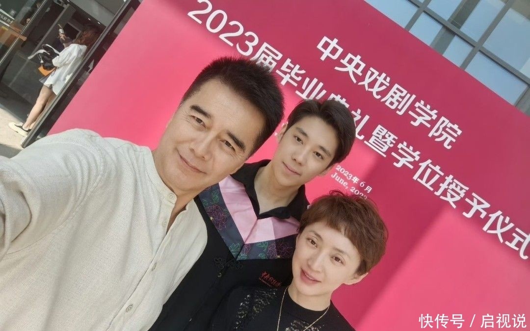 16. 2023年,许何顺利从中央戏剧学院毕业,许亚军携妻子张澎共同出席庆祝仪式,三人同框比耶合影,画面温馨如一家三口。多年相处下来,张澎早已成为许何生活中重要的女性角色,母子般亲密无间,常可见他们勾肩搭背谈笑风生。